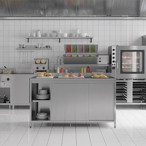 - INTEGRATED BACKSPLASH: Designed with an integrated backsplash as a functional and aesthetic feature, this worktable provides added protection against splashes, spills, and stains, safeguarding surrounding walls and surfaces, and facilitating hassle-free cleaning and maintenance, promoting a hygienic and sanitary kitchen environment.