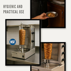 - Durable and Efficient Construction – Stainless Steel Skewer and Drip Plate: Equipped with a sturdy 12 x 12 mm skewer and 571 mm length, the machine keeps the meat stable during rotation and cooking. The 150 mm diameter stainless steel drip plate ensures clean and hygienic operation. Built with robust materials, it offers long-lasting performance and easy cleaning.