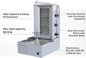 - Compact and Ergonomic Dimensions for Professional Kitchens: Measuring W555 x D635 x H910 mm, this vertical rotisserie grill is designed to fit into compact commercial kitchen spaces with ease. Weighing 25 kg, it remains stable during operation. Compatible with a 220V / 50Hz / single-phase power supply. Note: Conversion from natural gas to LPG should always be performed by a certified professional.