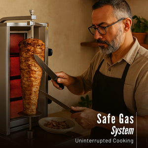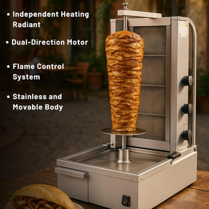 - High Meat Capacity – Ideal for Professional Use: This 3-burner gas doner kebab machine is designed for heavy-duty commercial use with a maximum capacity of 25 kg of meat. It ensures even cooking for large portions, making it perfect for busy restaurant kitchens, kebab shops, and catering businesses. Handle bulk orders efficiently without compromising on quality or taste.