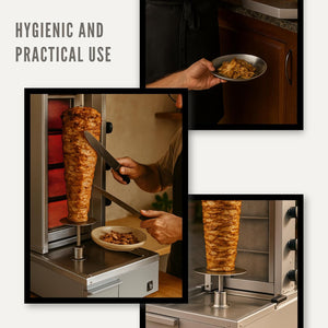 - Durable and Efficient Construction – Stainless Steel Skewer and Drip Plate: Equipped with a sturdy 12 x 12 mm skewer and 630 mm length, the machine keeps the meat stable during rotation and cooking. The 190 mm diameter stainless steel drip plate ensures clean and hygienic operation. Built with robust materials, it offers long-lasting performance and easy cleaning.