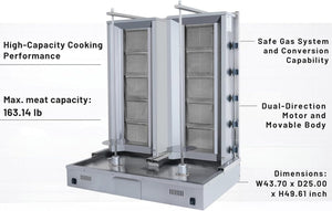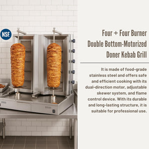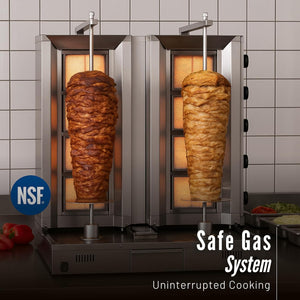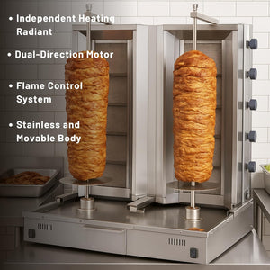 - High Meat Capacity – Ideal for Professional Use: This 10-burner gas doner kebab machine is designed for heavy-duty commercial use with a maximum capacity of 100+100 kg of meat. It ensures even cooking for large portions, making it perfect for busy restaurant kitchens, kebab shops, and catering businesses. Handle bulk orders efficiently without compromising on quality or taste.