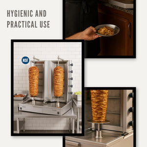 - Quiet and Balanced Rotating Motor: The motor rotates the meat at 1 turn per minute, allowing slow and even roasting. This low-speed rotation ensures the meat is cooked thoroughly and evenly, reducing the risk of burning or drying. It operates quietly, supporting a more pleasant working environment for kitchen staff.