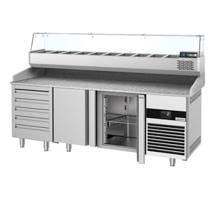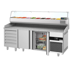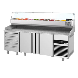 Pizza Preparation counter premium - 2100x800mm - 3 doors & 7 drawer - Included window showcase - 10x GN 1/3