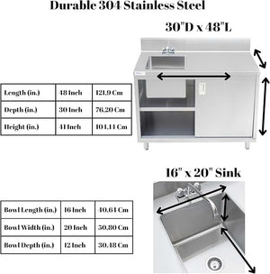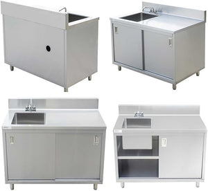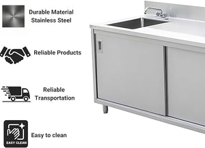 Stainless Steel Enclosed Base Work Table with Sink and Sliding Doors | Faucet and Free Standing Single Bowl Commercial Portable Kitchen Sinks Work Station with Elevating Legs (30x48x41 Inch)