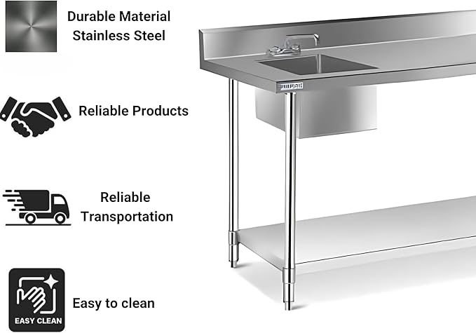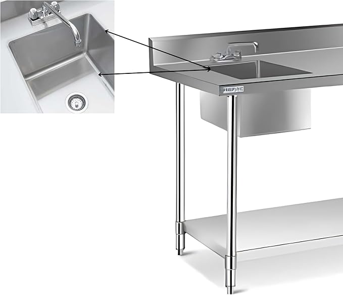 - High-Quality Stainless Steel Construction: This prep sink with countertop is constructed from premium 304 stainless steel, ensuring durability and resistance to rust and corrosion. The robust build guarantees a long lifespan, making it perfect for heavy-duty use in commercial kitchens, restaurants, hotels, and outdoor settings. The sleek and modern design also adds a professional look to any workspace.