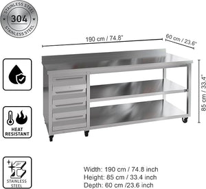 Stainless Steel Prep Table with Drawers and Wheels - Commercial Kitchen Work Table with Backsplash and Under Shelf - Heavy Duty Commercial Work Station for Restaurant, Hotel (75x23x33 inches)