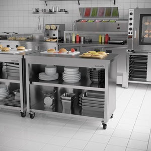 - ENHANCED MOBILITY WITH STURDY WHEELS: Equipped with heavy-duty wheels, the worktable ensures easy mobility and maneuverability, allowing for effortless transportation and repositioning within the kitchen space, enabling seamless adaptation to changing operational requirements or workflow demands.